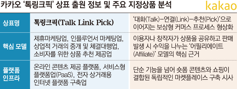 톡링크픽은 카카오톡의 숏폼 콘텐츠를 감상하며 마음에 드는 상품을 선택하고 이를 채팅방에 공유해 실제 구매가 발생하면 수익을 나눠 받는 보상형 제휴 마케팅 서비스다. 상표 출원 정보에 명시된 ‘제휴마케팅업’과 ‘광고 분석 프로그래밍’ 기술을 통해 카카오는 인플루언서뿐만 아니라 일반 이용자도 링크 공유를 통해 수익을 창출할 수 있는 차세대 관계형 커머스 플랫폼을 지향하는 것으로 점쳐진다. 기존의 선물하기 기능을 넘어 숏폼에 최적화된 완전히 새로운 커머스 인프라를 카카오톡 내부에 이식하겠다는 의지가 읽힌다.