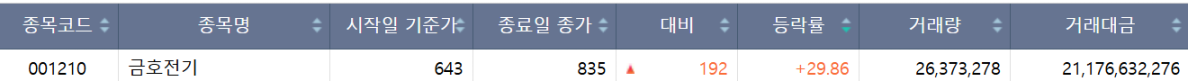 12일 코스피 시장에서 상한가를 기록한 종목은 금호전기다. 하한가는 없었다.