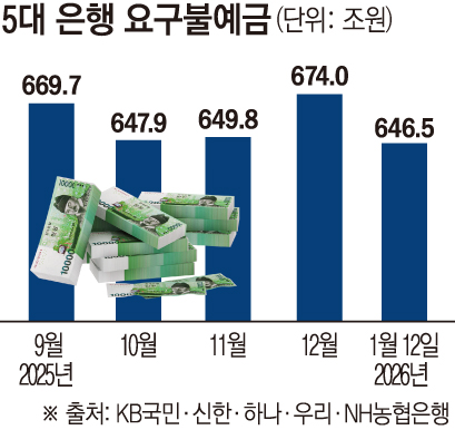 5대 은행 요구불예금 잔액 646조⋯지난해 말 대비 27조 빠져
