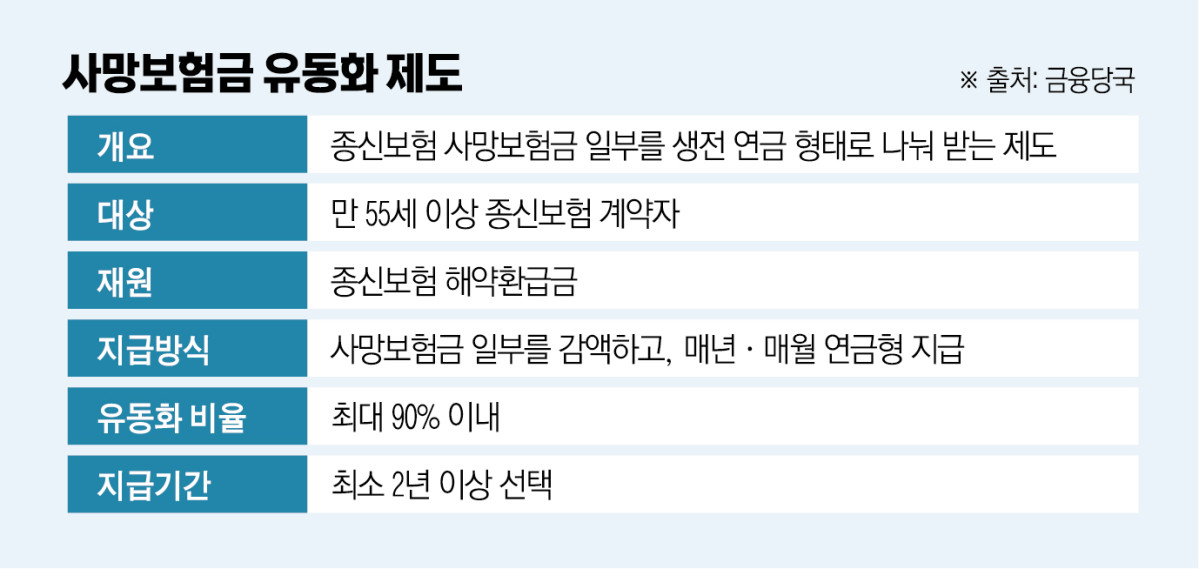 사망보험금 유동화는 사망 시점에 일시금으로만 지급되던 사망보험금을 보험계약자가 생전에 일정 기간 나눠 수령할 수 있도록 한 제도다. 계약자는 사망보험금의 일부를 감액하는 대신 최소 2년 이상 연금 형태로 매년·매월 현금흐름을 확보할 수 있다. 이를 통해 은퇴 이후 국민연금 수령 전후로 발생하는 소득 공백 구간의 생활비를 보완하는 수단으로 활용할 수 있다.
