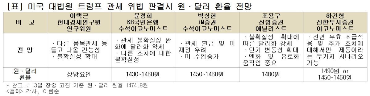 반면, 시나리오별로 짚어볼 필요도 있다는 관측도 있었다. 하건형 신한투자증권 이코노미스트는 “전면 무효화 및 소급 적용이 될 경우 금융시장 변동성 확대로 원·달러가 1490원까지 오를 수 있겠다”면서도 “향후 추가 관세에 대해서는 의회 승인이 필요하다는 취지의 판결일 경우에는 원·달러가 10원 내지 20원 정도 하락하는 재료일 것”이라고 예측했다.