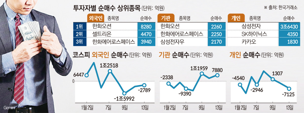 14일 한국거래소에 따르면 올해 외국인 순매수 상위종목은 한화오션(8280억 원), 셀트리온(4470억 원), 한화에어로스페이스(3940억 원), 네이버(NAVER‧3460억 원), 한미반도체(3410억 원) 등이다.