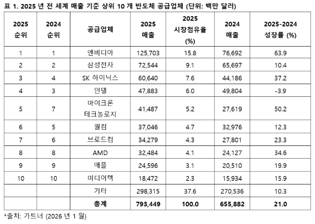 한편, 가트너의 순위는 반도체를 직접 설계해 자체 브랜드로 판매하는 업체를 기준으로 집계돼 순수 파운드리(반도체 위탁생산) 기업인 대만 TSMC는 이번 조사 대상에서 제외됐다. TSMC가 최근 발표한 실적에 따르면 2025년 매출은 약 1170억 달러로, 엔비디아에 이은 전 세계 2위 규모다.