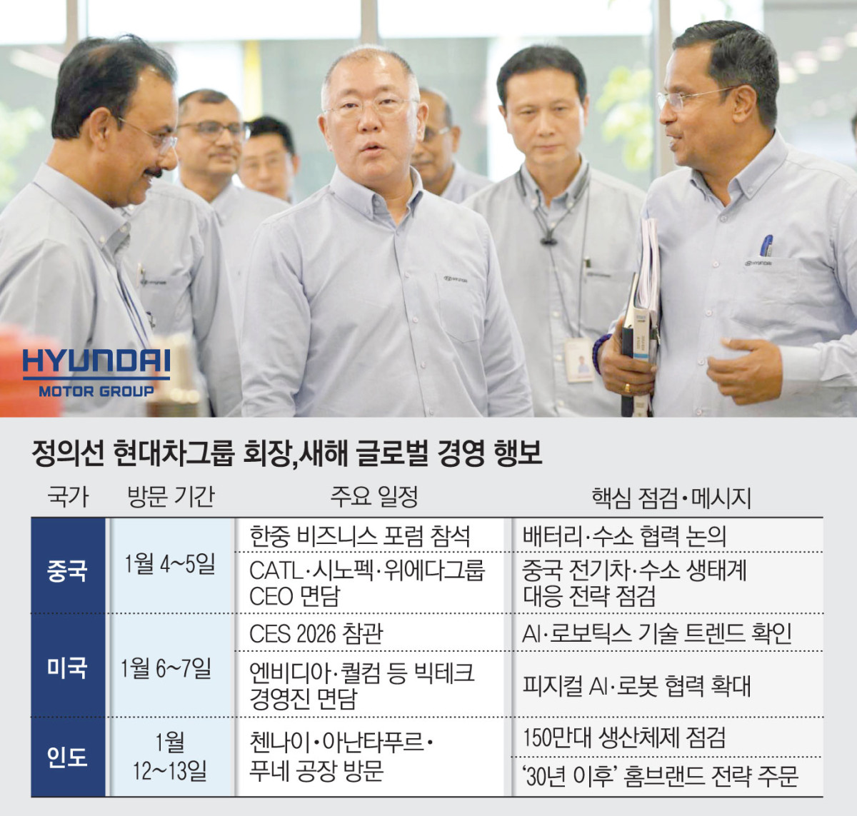 정의선 현대자동차그룹 회장이 2026년 새해 벽두부터 중국·미국·인도를 잇따라 방문하며 글로벌 경영 보폭을 넓히고 있다. 모빌리티와 수소, 인공지능(AI), 로보틱스 등 현재와 미래 사업 전반을 직접 점검하며 불확실성 국면 속에서도 중장기 성장 전략을 현장에서 다듬는 행보다.
