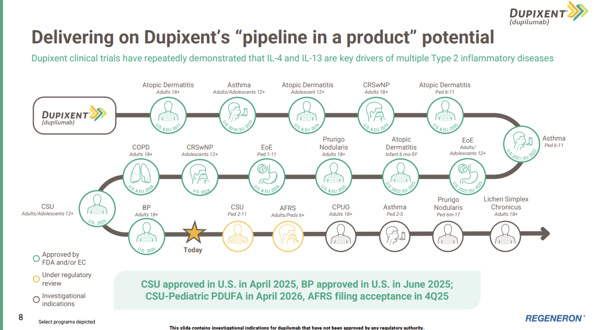 듀피젠트는 인터루킨-4 수용체α(IL-4Rα)에 결합하는 항체로, 제2형 염증 반응에 관여하는 IL-4와 IL-13 신호전달 경로를 저해하는 기전의 바이오의약품이다. 듀피젠트는 현재 미국 식품의약국(FDA) 기준으로 아토피피부염, 천식, 만성 비부비동염, 호산구성 식도염, 만성 폐쇄성 폐질환(COPD), 만성특발성 두드러기(CSU) 등 8개 적응증에 대해 승인받았으며, 지속적인 적응증 확대를 통해 치료 영역을 넓혀가고 있다. 지금까지 전세계적으로 130만명 이상의 환자가 듀피젠트 치료를 받고 있다.