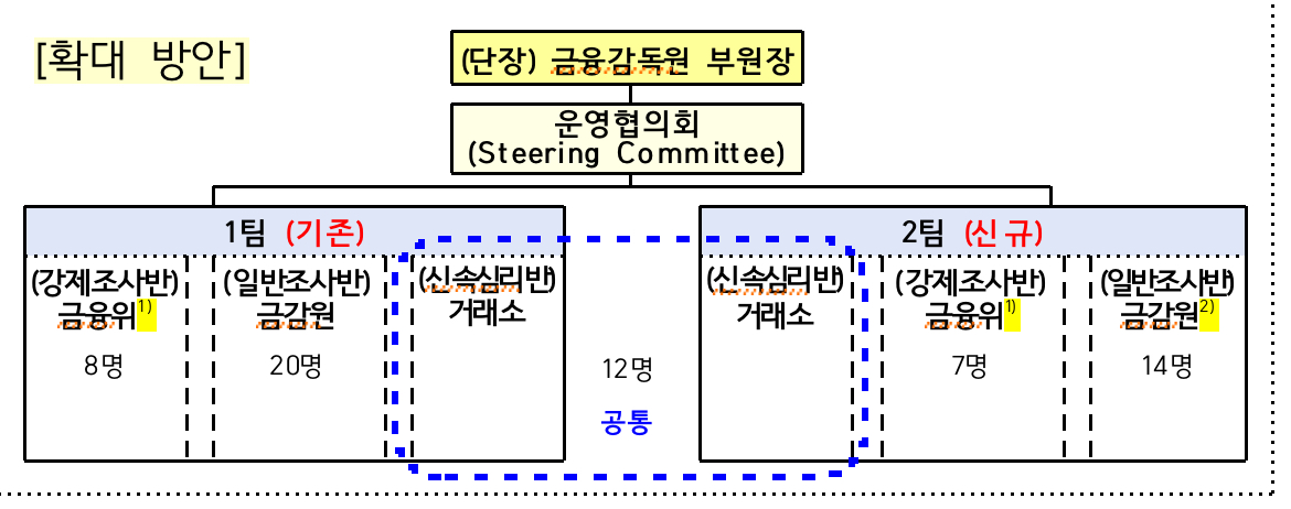 1팀 강제조사반에는 금융위 자본시장조사과 인력 8명이 그대로 배치되며, 2팀 강제조사반에는 증원된 인력 7명이 투입된다. 금감원 역시 1·2팀에 각각 20명씩을 배치하되, 2팀에는 우선 14명을 먼저 투입할 계획이다.