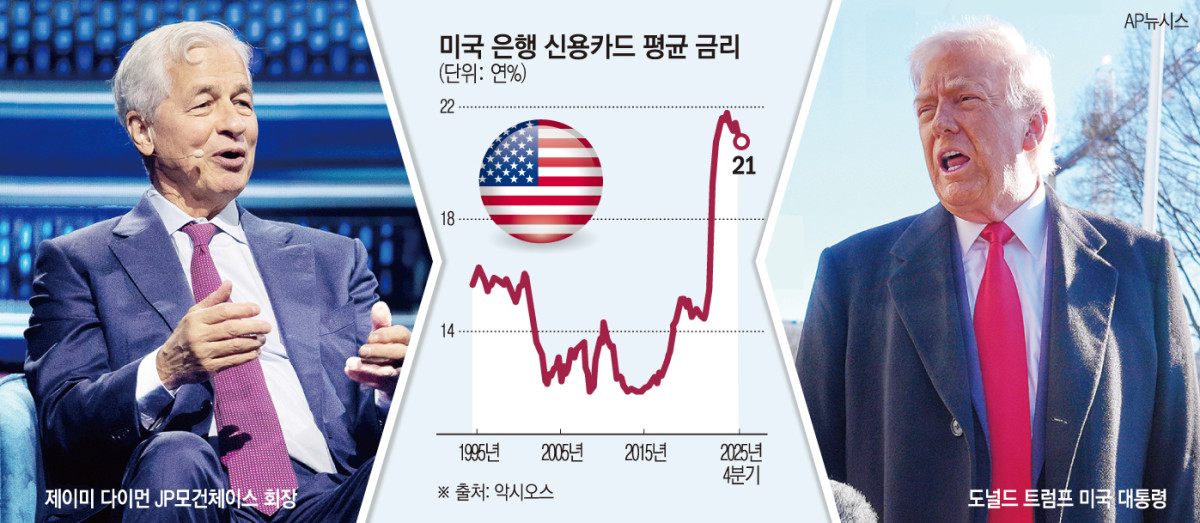 월가는 트럼프 대통령의 신용카드 금리 상한 요구에 대해서도 대립각을 세우고 있다. 앞서 트럼프 대통령은 9일 트루스소셜에 “신용카드 회사가 미국인에게 더는 바가지를 씌우는 일이 없게 하겠다”며 “신용카드 이자율을 20일부터 1년간 최대 10%로 제한할 것을 요구한다”고 압박했다. 미국 신용카드 평균금리는 20% 안팎이며 신용도가 낮으면 이보다 더 높은 금리가 적용된다.