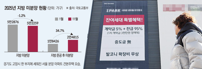 그러나 같은 기간 지방 미분양 규모는 제자리 수준에 머물렀다. 국토교통부에 따르면 지난해 11월 말 기준 비수도권 미분양 주택은 5만2259가구로 집계됐다. 1월 말(5만2876가구)과 비교하면 1.2% 감소하는 데 그쳤다.