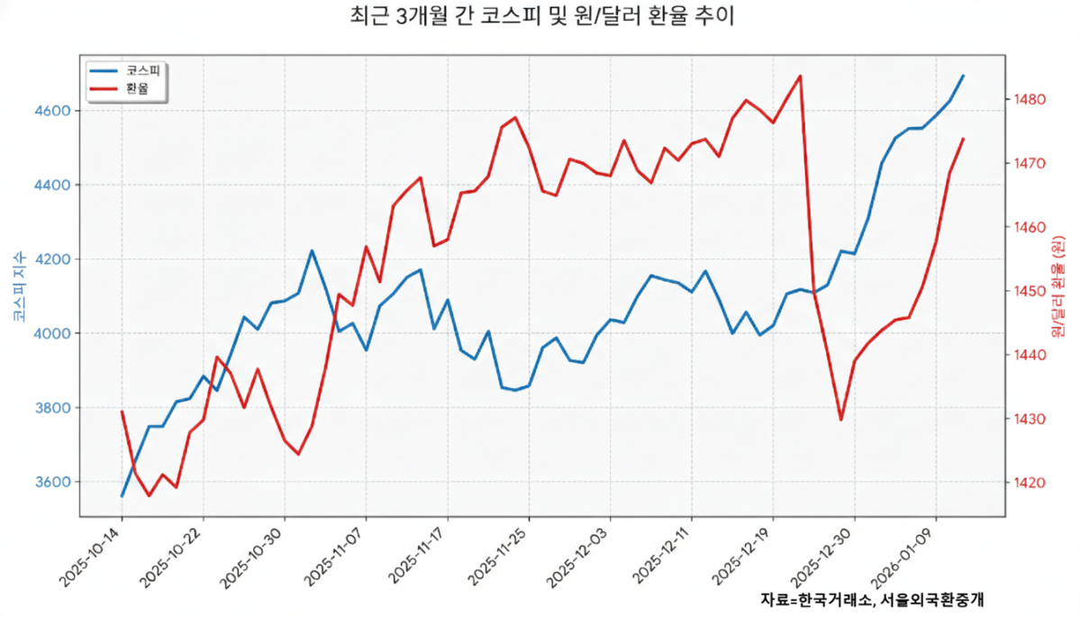새해 첫 거래일인 1월 2일 4309.63으로 출발한 코스피 지수는 13일 4692.64를 기록한 데 이어 14일 4723.10으로 마감하며 또 한 번 사상 최고치를 경신했다. 불과 9거래일 만에 지수가 약 413.47포인트(9.59%) 급등하며 기록적인 랠리를 보이고 있다. 환율 역시 가파른 수직 상승세를 보이고 있다. 지난해 연말 1420원대까지 낮아졌던 환율은 보름여 만에 50원 가까이 상승해 13일 1478.50원까지 치솟았다가 14일 1477.50원으로 소폭 하락하며 숨 고르기에 들어갔다.