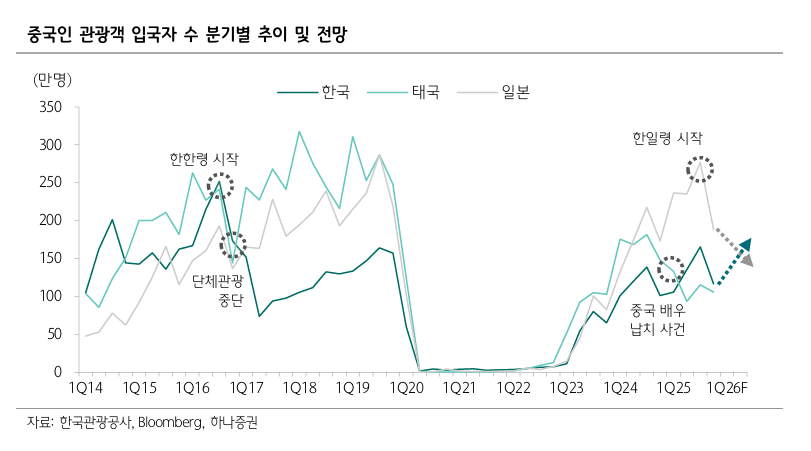 중국과 일본 간 관계 변화에 따른 반사 수혜도 주요 투자 포인트로 꼽았다. 하나증권은 과거 사드(THAAD) 사태 당시 중국 관광객 감소 이후 일본과 태국으로 수요가 이동했던 사례를 언급하며, 최근 중국의 일본향 노선 축소와 비자 발급 제한 움직임이 한국 인바운드 관광에 긍정적으로 작용할 가능성이 크다고 분석했다. 이에 따라 2027년 방한 관광객 수는 2350만 명, 이 가운데 중국인 관광객은 800만 명 수준으로 2016년 고점을 회복할 것으로 내다봤다.