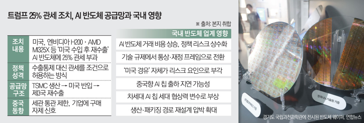 도널드 트럼프 미국 대통령이 14일(현지시간) 엔비디아의 인공지능(AI) 반도체 H200 등 ‘미국 수입 후 재수출’되는 반도체에 대해 25% 관세를 부과하기로 하면서 글로벌 AI 반도체 공급망이 새로운 변수에 직면했다. 수출을 막는 대신 관세를 조건으로 허용하는 방식이 공식화하면서 삼성전자와 SK하이닉스를 포함한 국내 반도체 업계의 긴장감도 높아지고 있다.