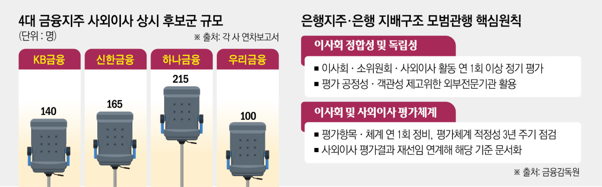 조명현 고려대 경영학과 교수는 “금융지주와 은행은 하나밖에 이사를 할 수 없고, 임기도 2년 이후 1년마다 재임용이 돼야 하는 등 제약이 많다”며 “능력 있는 후보자들은 다른 선택지가 있다면 금융지주는 별로 매력적이지 않다고 본다. 사람 구하기가 쉽지 않은 만큼 풀을 넓힐 수 있도록 여러 가지 제도적 보완이 있어야 한다”고 설명했다.