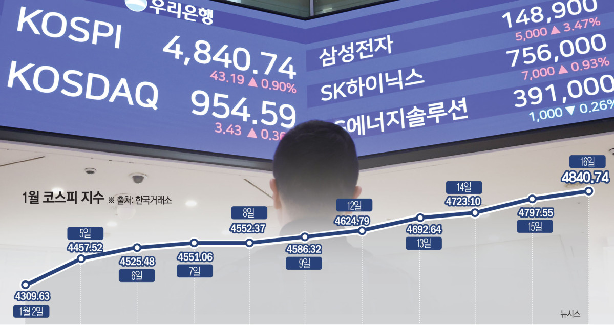 코스피가 연일 사상 최고치를 갈아치우며 4800선에 안착했다. ‘꿈의 지수’로 불리는 코스피 5000포인트(오천피)까지 160포인트(3%) 남았다.