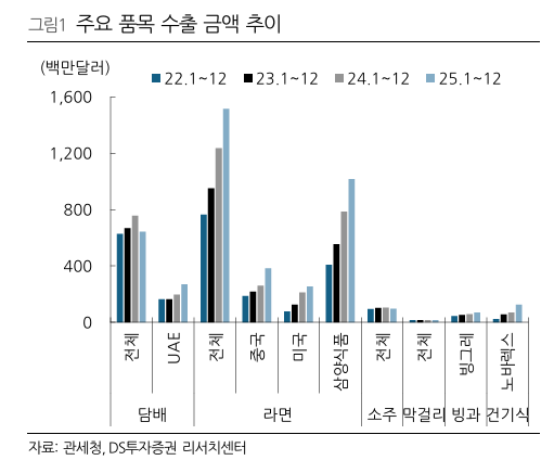 DS투자증권은 19일 음식료 업종에 대해 글로벌 시장을 중심으로 한 성장 모멘텀(동력)이 이어질 것으로 분석했다. 내수 둔화와 고환율 등 부담 요인이 존재하지만, K-푸드에 대한 글로벌 수요 확대와 수출 지역 다변화가 업종 전반의 실적을 뒷받침하고 있다는 평가다.