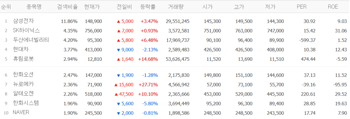 코스닥 시장에서도 급등 종목을 중심으로 검색어가 빠르게 늘었다. 로봇과 바이오 대형주가 단기간 주가 변동성을 키우며 투자자 관심을 끌었다.