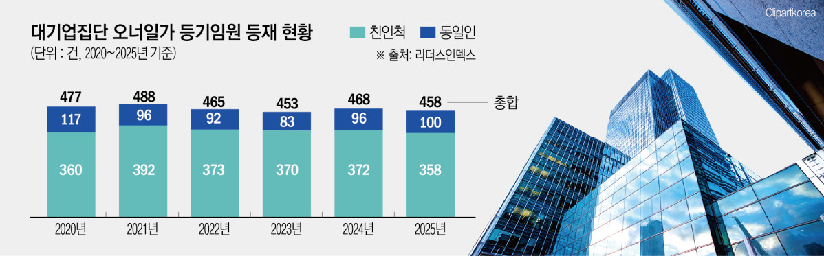 19일 기업분석연구소 리더스인덱스에 따르면 자산 5조 원 이상 대기업집단 가운데 최근 5년간 등기임원 비교가 가능한 49개 그룹을 조사한 결과, 총수가 맡은 등기임원직은 2020년 117개에서 2025년 100개로 14.5% 감소한 것으로 집계됐다. 같은 기간 오너 친인척의 등기임원 등재 건수도 360건에서 358건으로 소폭 줄었다.