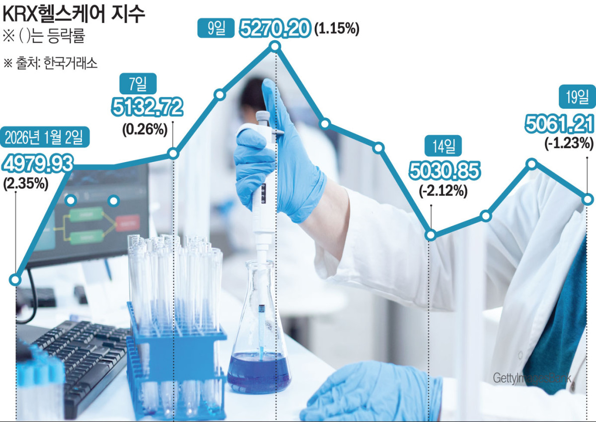 19일 한국거래소에 따르면 올들어 이날까지 코스피 지수가 16.38% 오르는 동안 KRX헬스케어지수는 4.02% 상승에 그쳤다. 바이오 최대 행사인 JP모건 콘퍼런스 기대감으로 한때 상승랠리를 이어갔지만, 최근 1주일은 3.97% 하락하며 온기 확산 흐름에서 비켜섰다. 바이오 섹터 전반이 아닌 개별 종목별로 강세를 보이는 데 그쳤다.