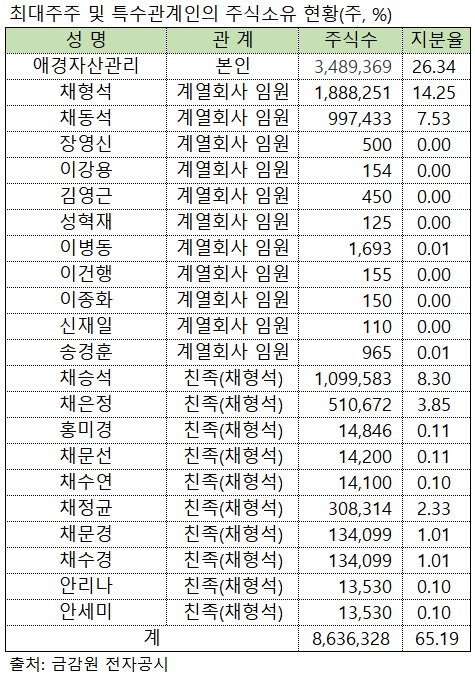 시장의 시선은 매수 주체인 애경자산관리에 주목된다. 애경자산관리는 채형석 총괄부회장이 지분 49.17%를 보유한 최대주주로 오너 일가가 지분 100%를 가진 비상장 가족회사다. 이번 지분 이동으로 채 총괄부회장을 정점으로 한 지배구조가 강화됐다는 평가가 지배적이다.