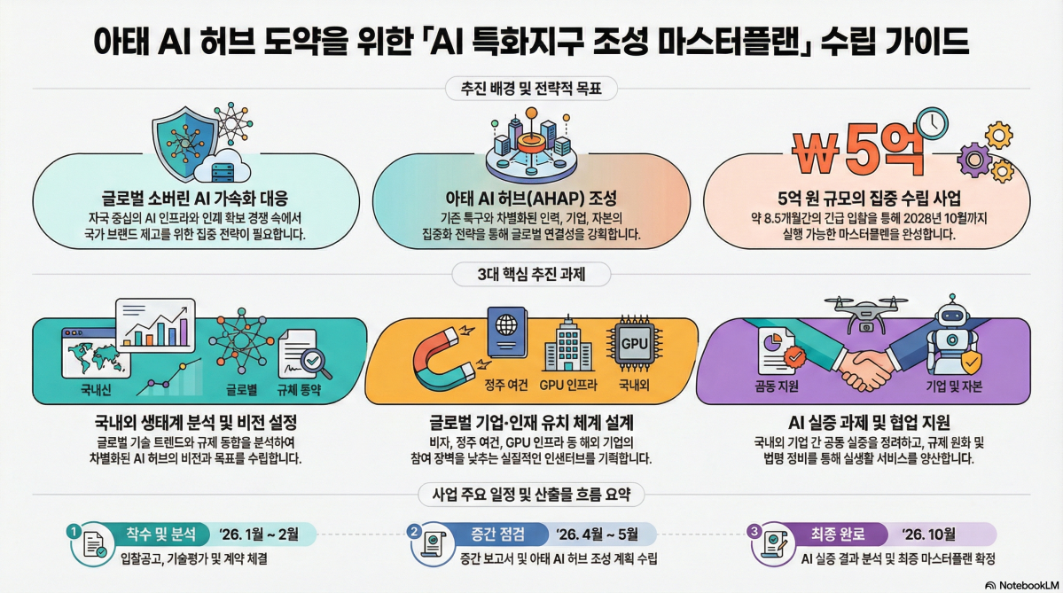 마스터플랜 수립에는 약 5억 원의 예산이 투입되며, 사업 기간은 계약 체결일부터 10월 30일까지 약 8.5개월이다. 정부는 상반기 내 실질적인 실행 틀을 마련하기 위해 긴급 입찰을 추진했다. 4월에는 중간보고서를 통해 핵심 전략을 도출하고, 5월에는 아태 AI 허브 조성 계획(안)을 구체화한다. 이후 실증 과제 결과를 반영해 10월 최종 마스터플랜을 확정한다는 일정이다.