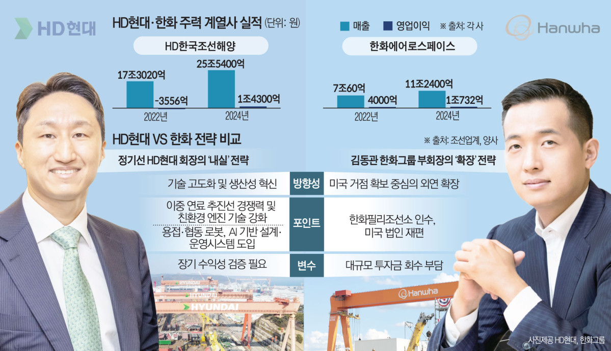 글로벌 조선업이 조정 국면에 접어들면서 국내 조선업계를 이끄는 두 리더의 전략도 시험대에 올랐다. 정기선 HD현대 회장과 김동관 한화그룹 부회장은 각각 내실과 확장이라는 서로 다른 방향의 전략을 택했지만, 어느 한쪽이 명확한 우위에 있다기보다는 기대와 리스크를 동시에 안고 있다는 평가가 나온다.