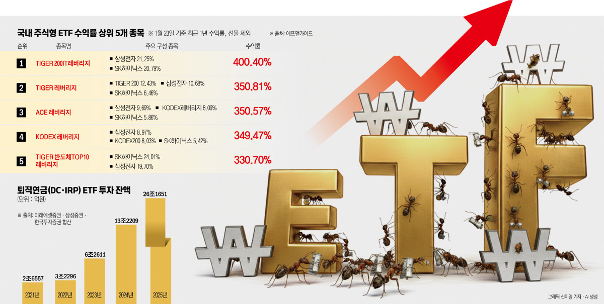 ETF가 퇴직연금 내 주요 투자 수단으로 부상한 배경에는 매매 편의성과 저(低)비용 구조가 자리한다. ETF는 주식처럼 실시간 거래가 가능하면서도, 펀드 대비 운용보수가 낮다. 코스피200이나 미국 스탠다드앤드푸어스(S&P)500·나스닥100 같은 대표 지수는 물론 인공지능(AI), 반도체, 조선 등 특정 테마에도 손쉽게 분산 투자가 가능하다. 연금처럼 20~30년 이상 장기 투자하는 경우, 작은 보수 차이가 누적 수익률에서 큰 격차로 이어질 수 있다는 인식도 작용했다.