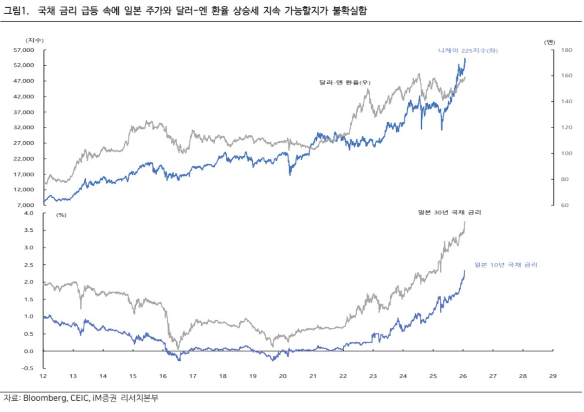 박상현 iM증권 이코노미스트는 21일 “일본 국채 금리가 저금리 국면을 벗어나 주식시장에 우호적 환경이 아니다”며 “다카이치 트레이드가 한계점에 이르고 있다”고 이같이 밝혔다.