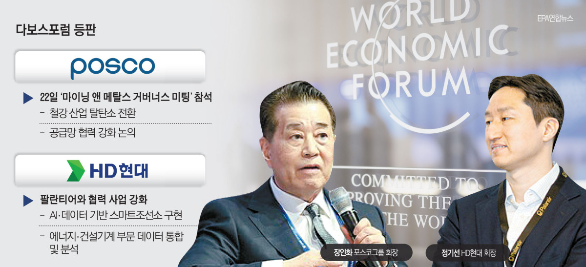장인화 포스코그룹 회장과 정기선 HD현대 회장 등 국내 철강·조선·에너지 기업 총수들이 스위스에서 열리는 ‘세계경제포럼 연차총회’(다보스포럼)에 참석해 인공지능(AI), 에너지 전환 등 미래 산업을 논의하고 새로운 사업 기회를 모색한다.