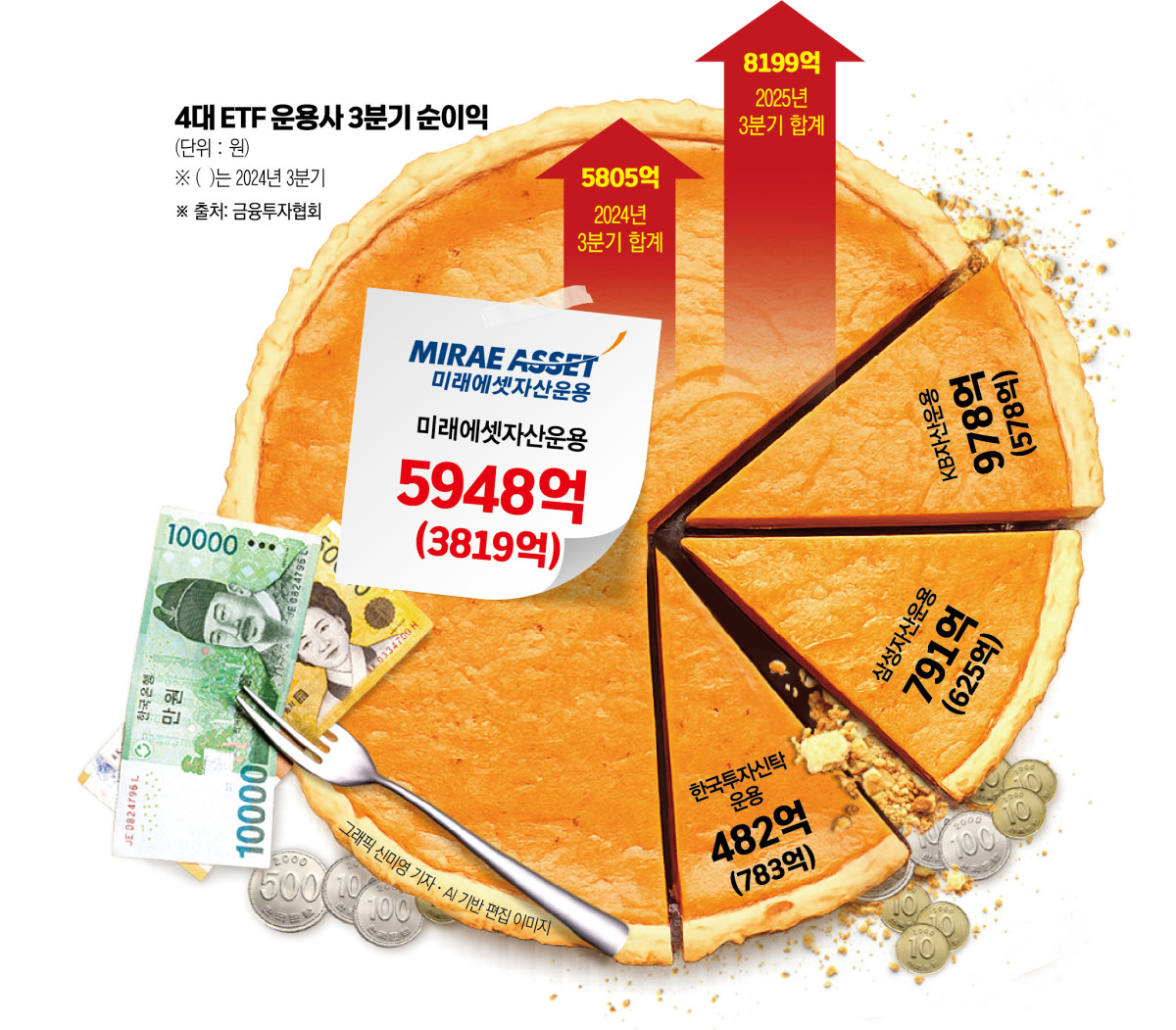 26일 금융투자협회에 따르면 미래·삼성·한국·KB자산운용 등 주요 자산운용사 4곳의 3분기 당기순이익은 8199억 원으로 집계됐다. 1년 전 같은 기간(5805억 원)과 비교해 2000억 원 넘게 늘었다. 같은 기간 영업이익도 2500억 원 이상 증가했다.