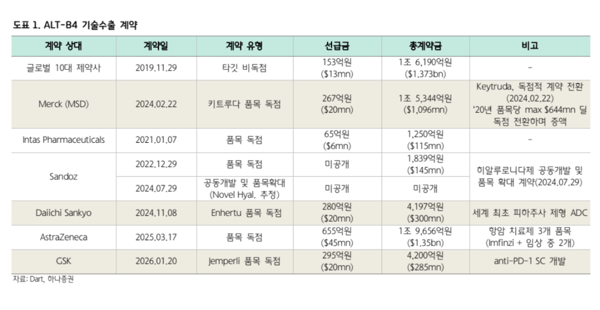 구체적으로 하나증권은 기존에 2025~2029년으로 추정했던 키트루다 관련 기술료 수익 합계를 약 15억 달러에서 9억4000만 달러로 조정했다. 또한 향후 신규 라이선스아웃(L/O)의 계약 구조를 재점검하며 단일 품목 기준 마일스톤 합계도 기존 5억8000만 달러 수준에서 2억6000만~2억8000만 달러로 낮춰 반영했다.