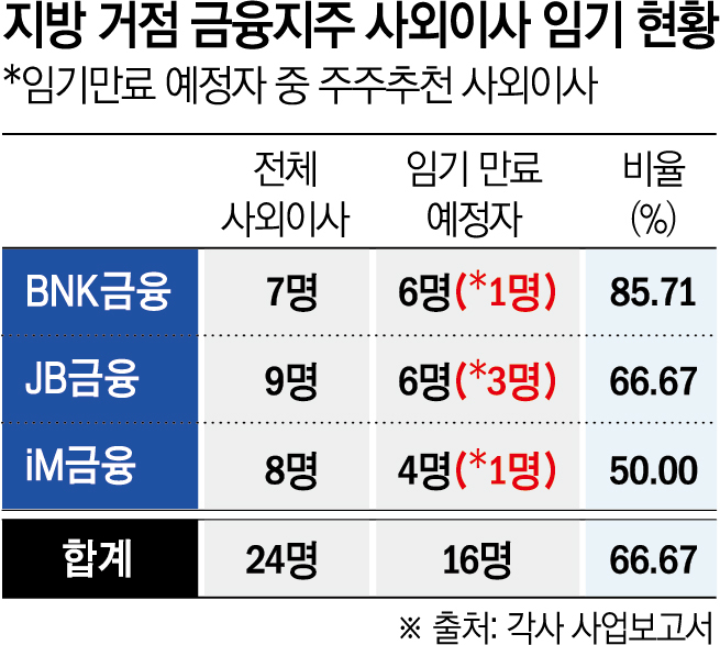 22일 금융권에 따르면 BNK·JB·iM금융 사외이사 총 24명 중 16명(66.67%)이 3월 임기 종료를 앞두고 있다. 임기 만료 예정자 16명 중 주주 추천 경로로 선임된 인사는 현재 5명이다. 하지만 당국의 ‘지배구조 모범관행’ 이행 압박과 주주들의 요구가 맞물리면서 이번 교체기 내 주주 추천 인사의 비중 확대 및 연임 여부가 핵심 쟁점으로 부상했다.
