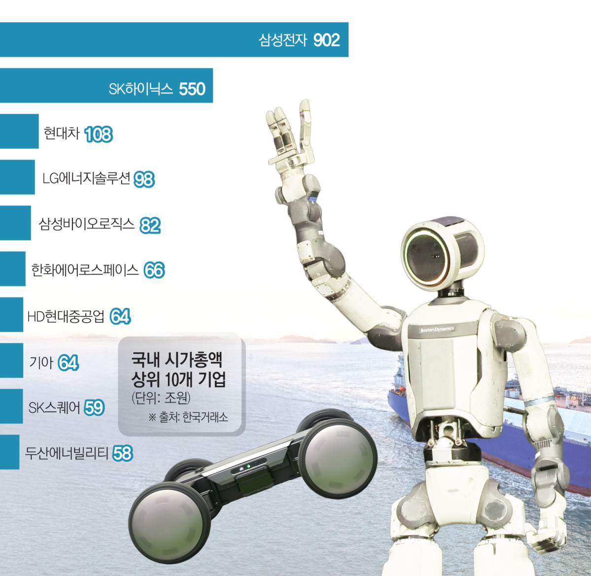 22일 한국거래소에 따르면 ‘5000피’ 돌파의 주역인 시가총액 상위 10개 기업의 시총 규모는 2000조 원을 웃돈다. 코스피 전체 시총 약 4100조 원의 절반에 달하는 규모다. 반도체(삼성전자·SK하이닉스), 자동차·로봇(현대차·기아), 이차전지(LG에너지솔루션), 원전·방산(한화에어로스페이스·HD현대중공업·두산에너빌리티), 투자·리밸런싱(SK스퀘어), 바이오(삼성바이오로직스) 등은 국내 증시를 떠받치고 있다.