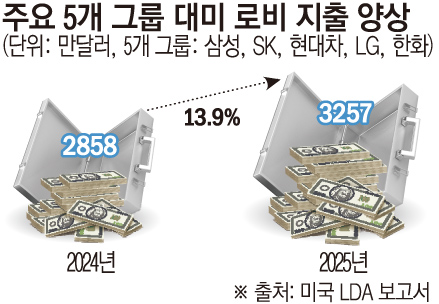 2일 본지가 국내 주요 5개 그룹(삼성·SK·LG·현대차·한화 등 계열사 포함) 미국 상원에 제출한 로비공개법(LDA) 보고서를 분석한 결과 이들 그룹은 지난해 총 3257만 달러(약 478억 원)를 대미 로비 비용에 지출한 것으로 집계됐다. 이는 전년보다 14% 가까이 증가한 수준이다.
