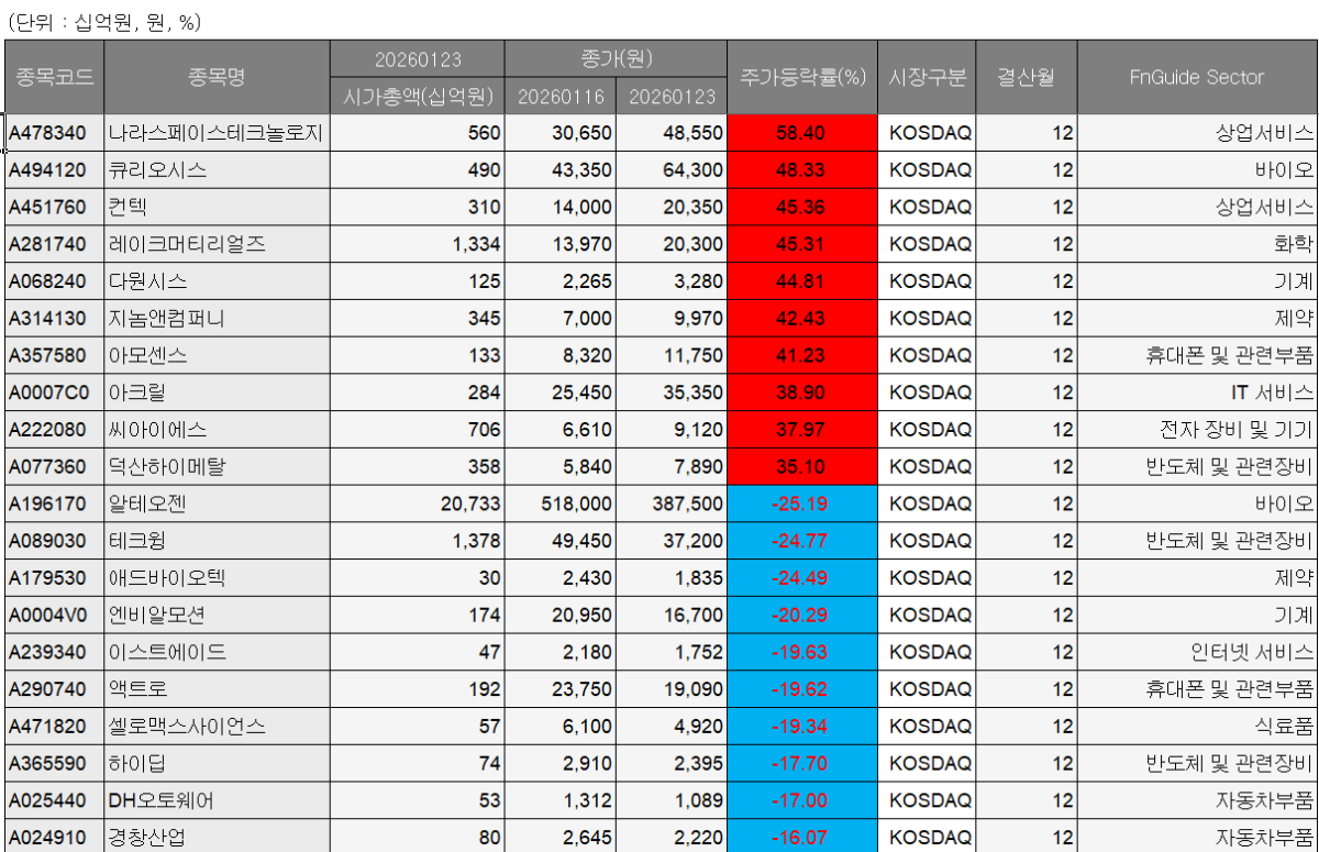 바이오와 반도체·부품 업종 전반도 약세를 면치 못했다. 테크윙(-24.77%), 애드바이오텍(-24.49%), 엔비알모션(-20.29%), 이스트에이드(-19.63%), 액트로(-19.62%), 셀로맥스사이언스(-19.34%) 등이 하락했다. 이 밖에 하이딥(-17.70%), DH오토웨어(-17.00%), 경창산업(-16.07%)도 조정을 받았다. 시장에서는 지수 방향성이 뚜렷하지 않은 가운데, 단기 수익률이 높았던 종목을 중심으로 선별적인 차익 실현이 이어지고 있다는 분석이 나온다.