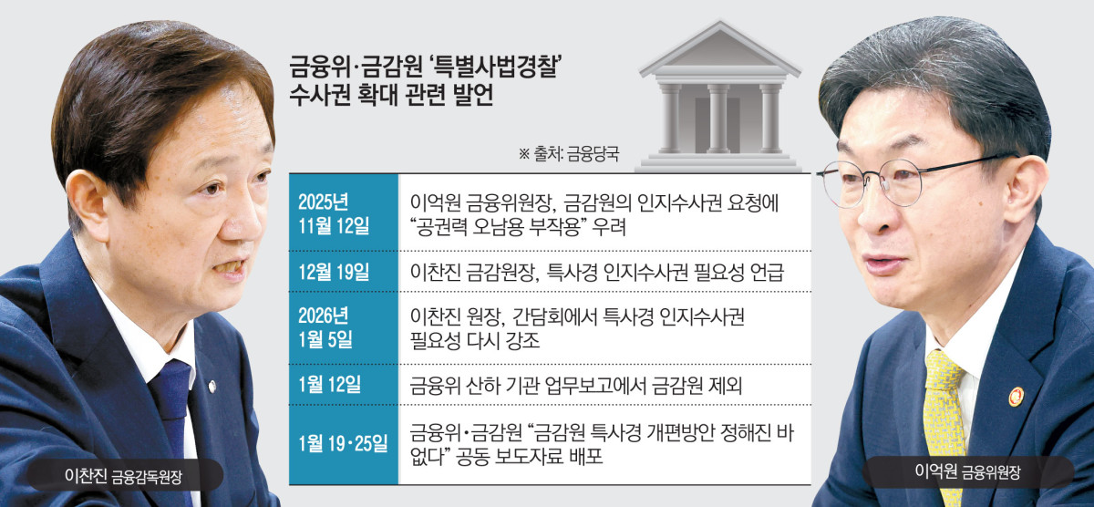 26일 금융당국 안팎에 따르면 금융위와 금감원 간 긴장 관계는 지난해 12월 19일 대통령 업무보고 전후를 기점으로 수면 위로 떠올랐다. 이후 조직 개편과 감독 권한 조정을 둘러싼 이견이 이어지다, 이달 들어 금감원 특사경 논의가 본격화되면서 갈등이 가시화되는 양상이다.