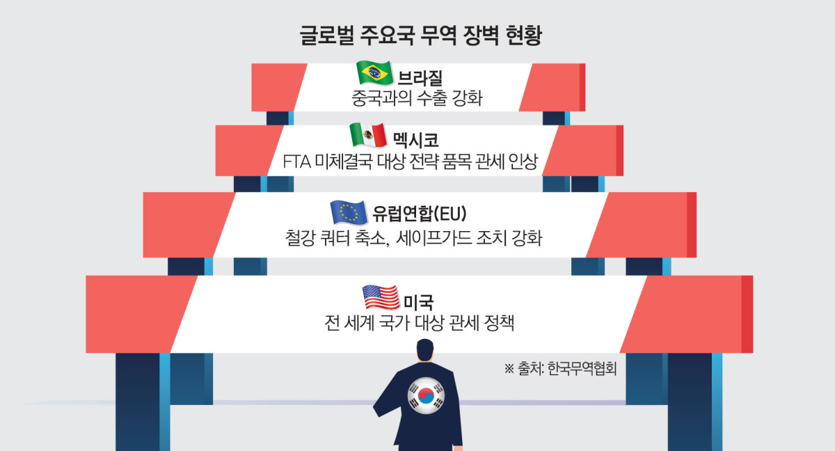 산업별로도 수입 장벽이 강화되고 있다. EU는 철강 수입 쿼터 총량을 대폭 줄이고 초과 물량에 대한 관세율을 50%까지 인상했으며, 캐나다도 철강 수입 규제 대열에 합류했다. 멕시코는 올해부터 한국을 포함한 FTA 미체결국을 대상으로 자동차·기계부품 등 전략 품목 관세를 최대 50%까지 인상했고, 브라질과 인도도 관세 인상과 수입 제한 조치를 병행하고 있다. 미국→중국→제3국으로 이어지는 보호무역의 연쇄 반응이 글로벌 무역 환경의 구조적 변화로 굳어지는 모습이다.