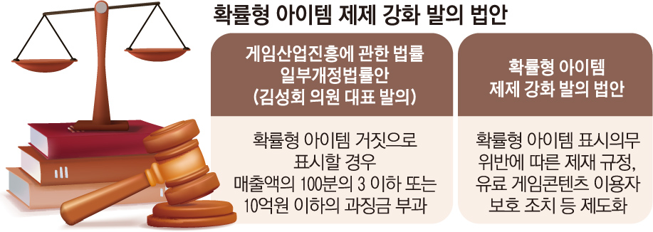 국회 의안정보시스템에 따르면 김성회 민주당 의원은 지난달 게임산업진흥에 관한 법률 일부개정법률안을 대표 발의했다. 확률형 아이템의 종류 및 종류별 공급 확률정보 등을 표시하지 않거나 거짓으로 표시할 경우 매출액의 3% 이하 또는 10억 원 이하의 과징금을 부과할 수 있도록 한 것이 법안의 골자다.