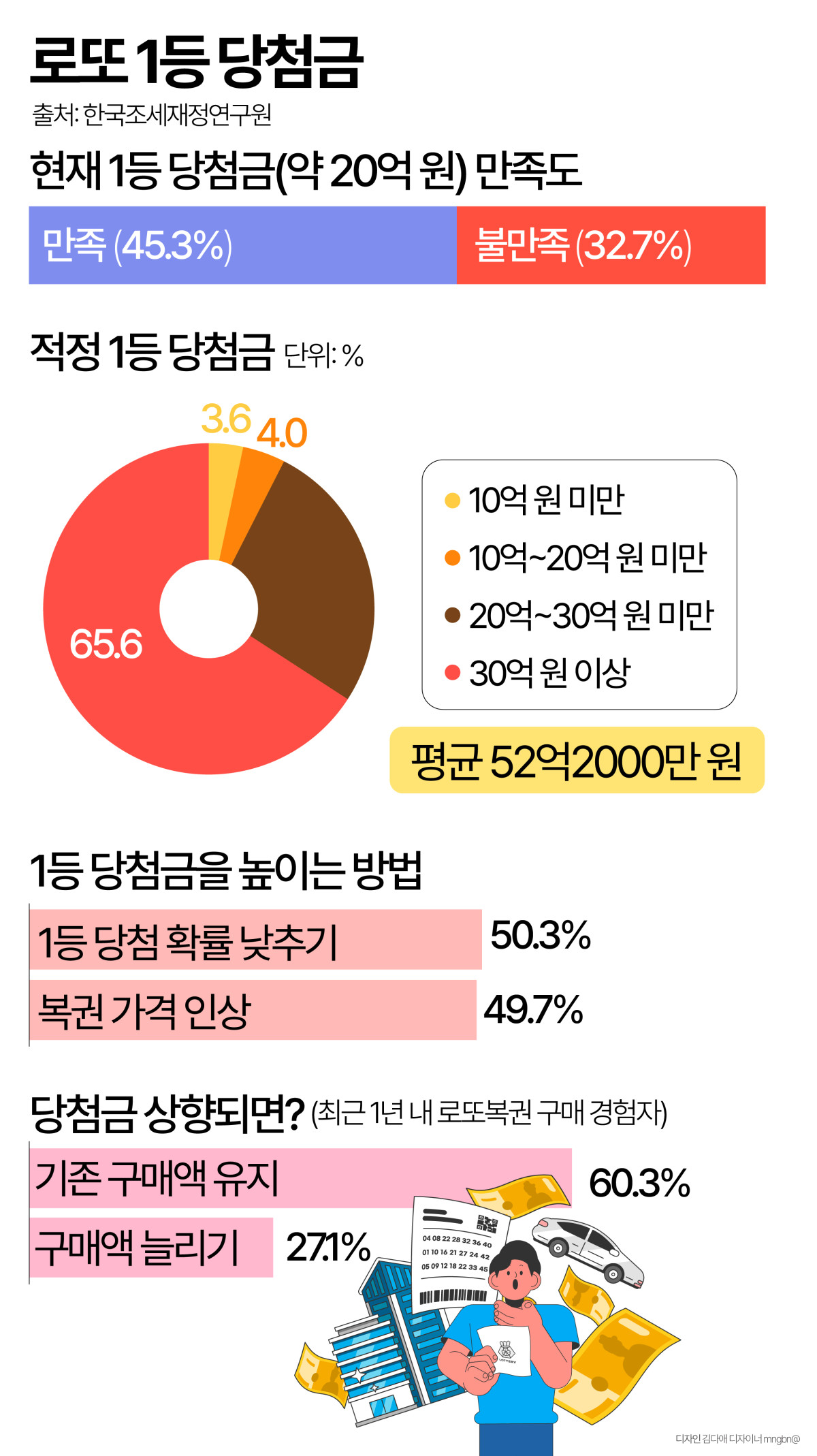 한국조세재정연구원이 지난해 만 19~34세 남녀 5000명을 대상으로 온라인 조사를 한 결과 현재 약 20억 원인 로또복권 1등 당첨금에 만족하다고 답한 비율은 45.3%였다. 불만족하다는 32.7%였다.