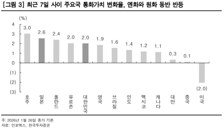 다만 문 연구원은 “원화 약세에 대한 심리가 온전히 꺾였다고 보긴 어려워 레벨을 낮출 때마다 달러 실수요가 유입될 것”이라고 말했다. 이어 “트럼프의 관세 부과 위협과 함께 이란·그린란드 등을 둘러싼 지정학적 불안이 원화의 잠재적 약세 압력으로 남아 있다”고 설명했다.