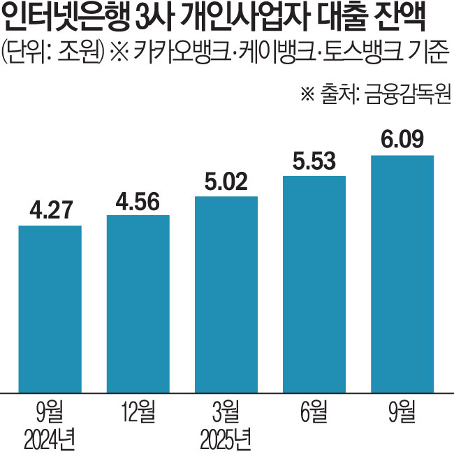 2일 금융감독원 금융통계정보시스템에 따르면 카카오뱅크·케이뱅크·토스뱅크 등 인터넷은행 3사의 개인사업자 대출 잔액은 지난해 9월 기준 6조878억 원으로 집계됐다. 2024년 9월과 비교하면 42.6%(1조 8184억 원) 늘어난 규모다. 지난해 3월 5조 원대를 처음 기록한 데 이어 반년 만에 6조 원대를 넘어섰다.