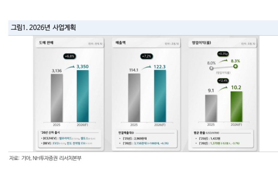 NH투자증권은 기아가 미국에서는 하이브리드(HEV), 유럽에서는 전기차(EV)를 축으로 한 지역별 맞춤 전략을 강화하며 2026년 공격적인 사업 계획을 제시했다고 평가했다. 환율 효과와 차종 믹스 개선을 바탕으로 실적 턴어라운드가 본격화될 것이란 전망이다. NH투자증권은 기아에 대해 투자의견 매수와 목표주가 21만 원을 유지했다.