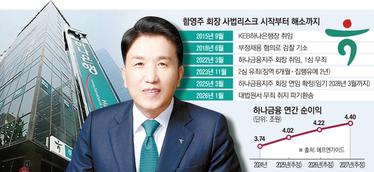 하나금융 관계자는 "함 회장의 무죄 확정으로 남은 임기 2년간 리스크 없이 다양한 전략 추진 동력이 안정화될 것으로 기대된다"고 말했다.