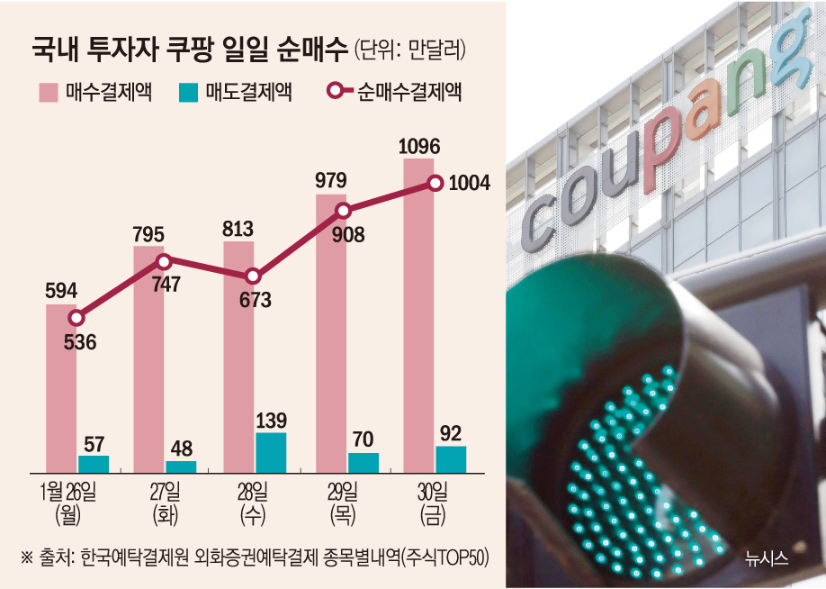 3일 한국예탁결제원에 따르면 1월 한 달간 국내 투자자들의 쿠팡 순매수 그래프는 가파른 우상향 곡선을 그리고 있는 것으로 나타났다. 쿠팡은 1월 3주차에 해외 주식 순매수액 1280만 달러로 50위권(44위)에 진입했는데 4주차 들어 3869만 달러로 3배 이상 폭증하면서 11위까지 밀고 올라왔다.