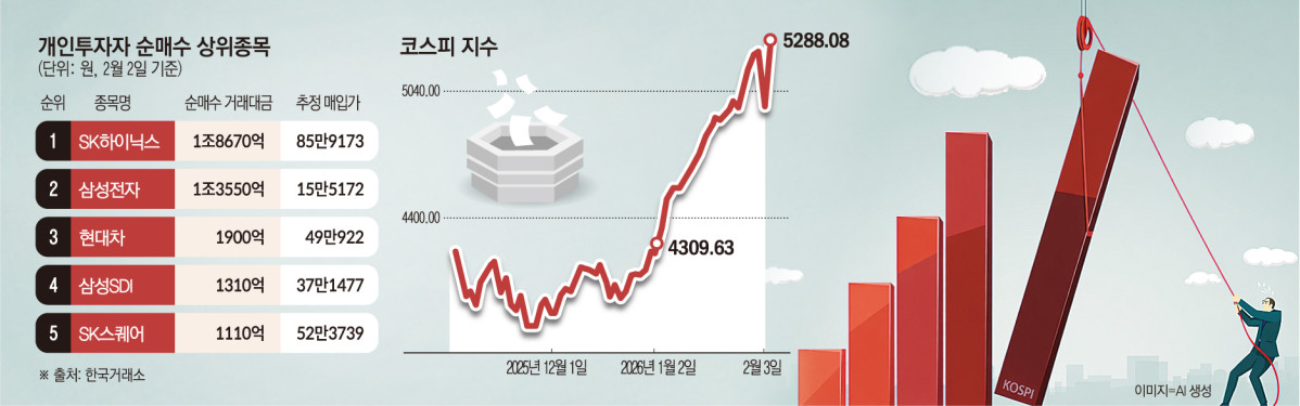 3일 증시에서 개인은 삼성전자를 1조3400억원, SK하이닉스를 4180억원 순매도했다. 코스피 시장에서 개인 순매도 규모는 2조1700억 원에 달했다.