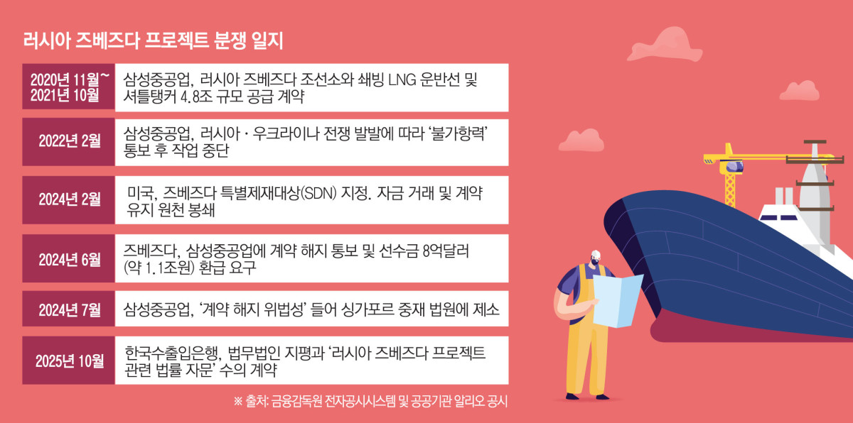 분쟁의 발단인 즈베즈다 프로젝트는 삼성중공업이 2020년부터 2021년까지 러시아 즈베즈다 조선소로부터 수주한 약 4조8000억 원 규모의 선박 건조 사업이다. 2022년 2월 전쟁 발발 직후 삼성중공업은 정상적인 공정 진행이 불가능한 '불가항력(Force Majeure)' 상황임을 선주사에 알리고 작업을 중단했다. 이후 2024년 2월 미국 정부가 즈베즈다를 특별제재대상(SDN)으로 지정하며 자금 거래가 원천 봉쇄됐다. 이에 즈베즈다 측은 삼성중공업에 2024년 6월 계약 해지를 통보하며 선수금 약 8억달러(1.1조원)의 반환을 요구했다. 이에 삼성중공업이 즉각 싱가포르 국제중재센터(SIAC)에 소송을 내며 대응에 나선 가운데 선수금 환급보증(RG)을 인수한 수은의 보증 책임 범위가 이번 분쟁의 핵심 쟁점으로 떠올랐다.