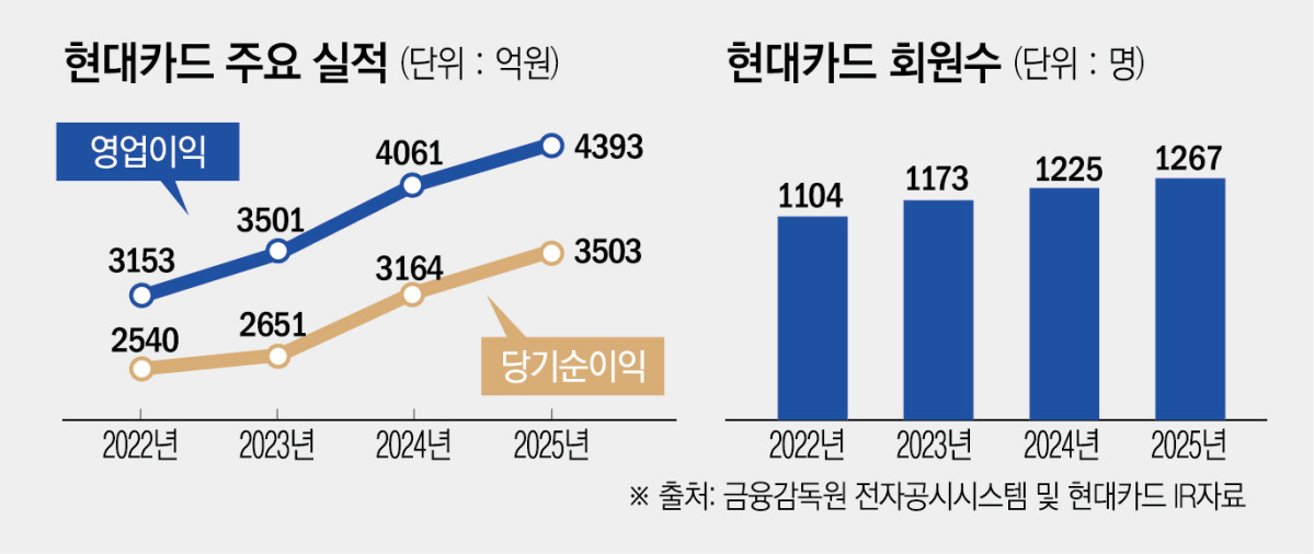4일 여신금융업계에 따르면 현대카드는 지난해 영업이익 4394억원, 당기순이익 3503억원을 기록했다. 각각 전년 대비 8.2%, 10.7% 늘어난 수치다. 같은 기간 카드사 전반이 조달 비용 상승과 비용 부담 확대로 이익 성장에 제약을 받은 것과 비교하면 상대적으로 선방했다는 평가가 나온다.
