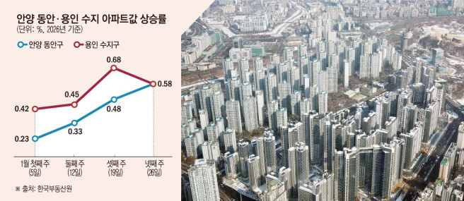 4일 한국부동산원 주간 아파트가격동향에 따르면 안양 동안구 아파트값은 1월 첫째 주 0.23% 상승한 데 이어 둘째 주 0.33%, 셋째 주 0.48%, 넷째 주 0.58%로 상승 폭이 연속 확대됐다. 용인 수지구도 같은 기간 첫째 주 0.42%에서 셋째 주 0.68%까지 치솟은 뒤 넷째 주에도 0.58%의 높은 수준을 유지했다.