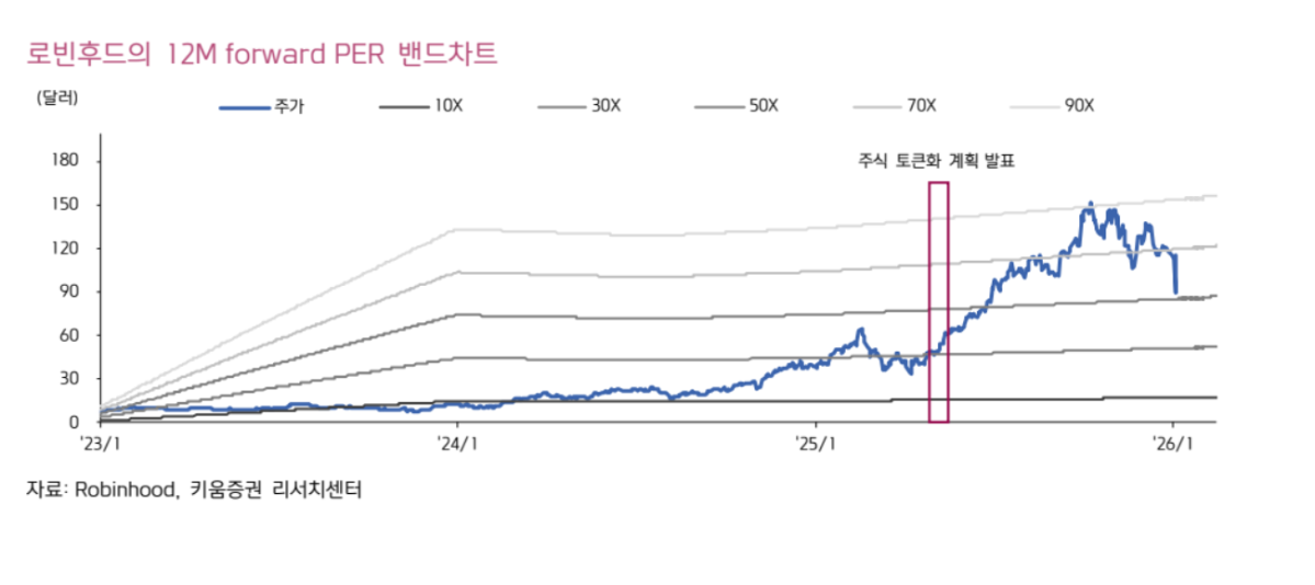 키움증권은 미래에셋증권의 2026년 순이익 추정치 1조8000억 원에 목표 주가수익비율(PER) 20배를 적용해 목표주가를 6만5000원으로 산출했다. 안 연구원은 “로빈후드가 토큰화 전략 발표 이후 PER 30배 이상으로 재평가된 점을 감안하면 국내 시장 여건을 반영한 보수적 적용”이라며 “사업 전개 속도에 따라 추가 상향 가능성도 열려 있다”고 덧붙였다.