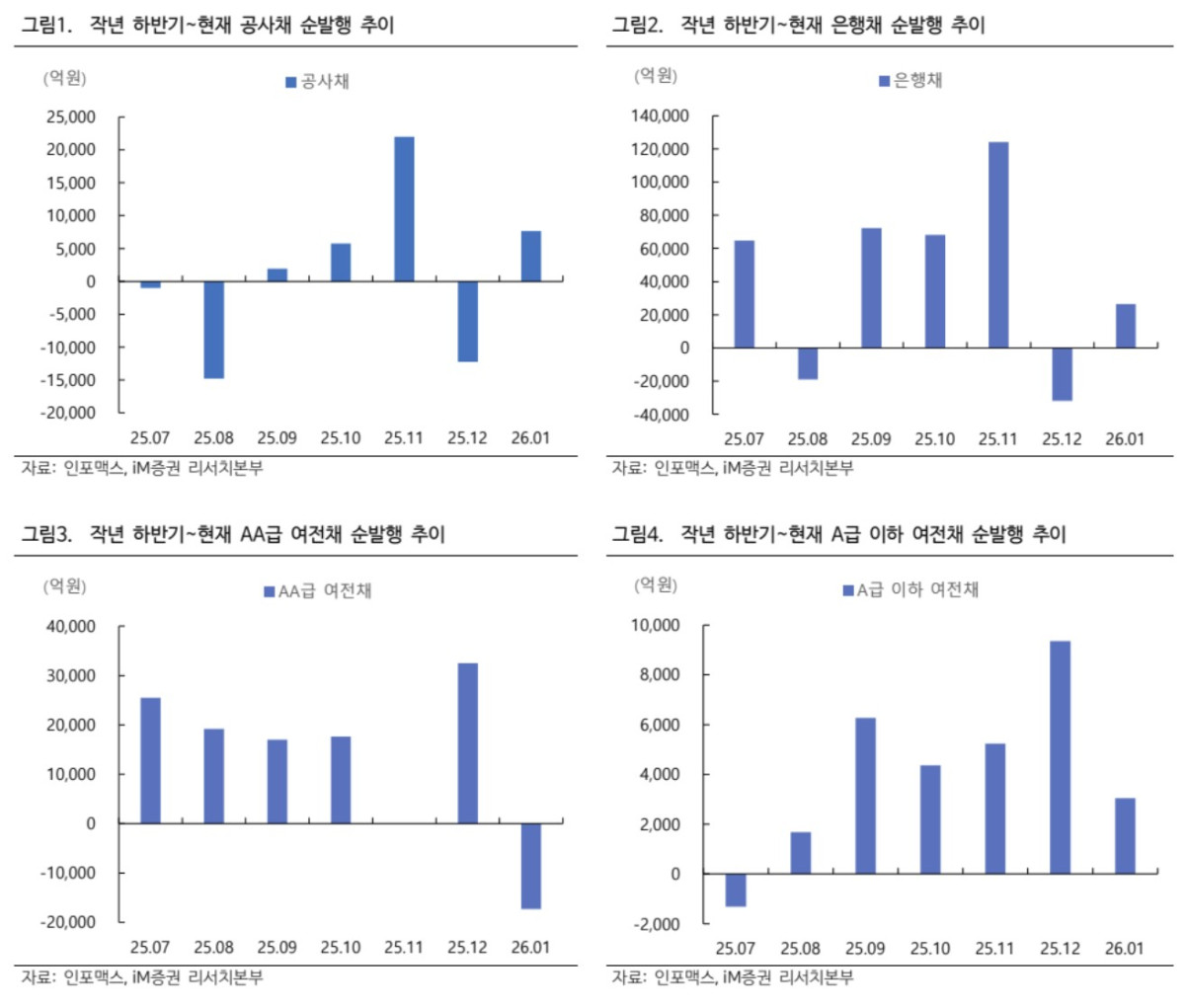 이승재 iM증권 연구원은 “1월 발행시장은 전반적으로 부진했다”며 “은행채는 소폭 순발행을 기록했으나 특수은행 비중이 컸고, 지난해 12월까지 순발행을 이어온 AA급 여전채는 대규모 순상환을 기록했다”고 말했다.