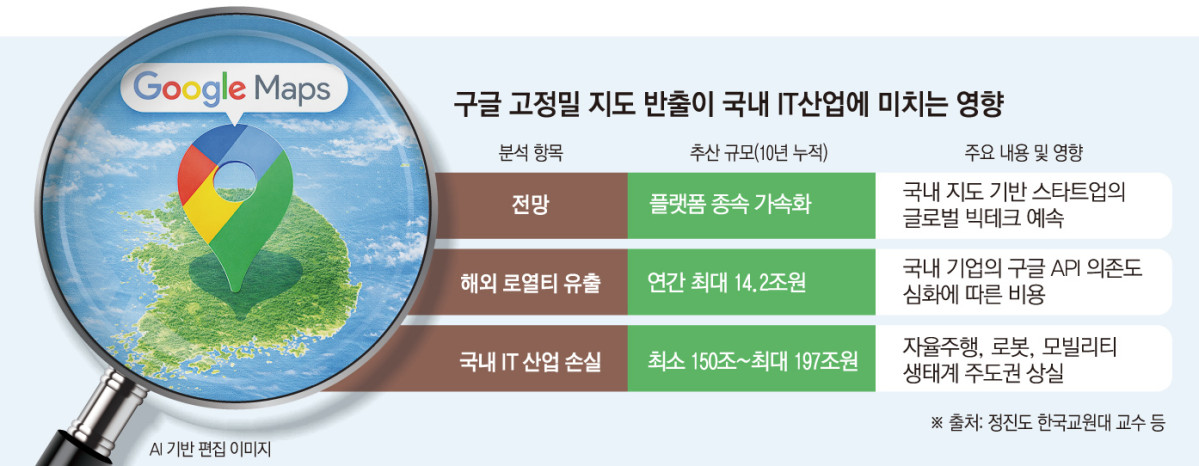 특히 국내외 업체 간 공정한 경쟁 환경이 조성되지 않은 상황에서 지도가 반출되면 향후 10년 간 최대 197조원의 경제적 손실이 발생할 수 있다는 연구 결과까지 나왔다. 정진도 한국교원대 교수는 “API 이용료 등 해외로 빠져나가는 로열티 비용만 연간 최소 6조3000억원에서 최대 14조2500억원에 이를 것으로 추산된다”며 “올해부터 2035년까지 10년 간 지도 반출에 따른 누적 총비용은 시나리오별로 최소 150조6800억원에서 최대 197조3800억원에 달한다”고 지적했다.