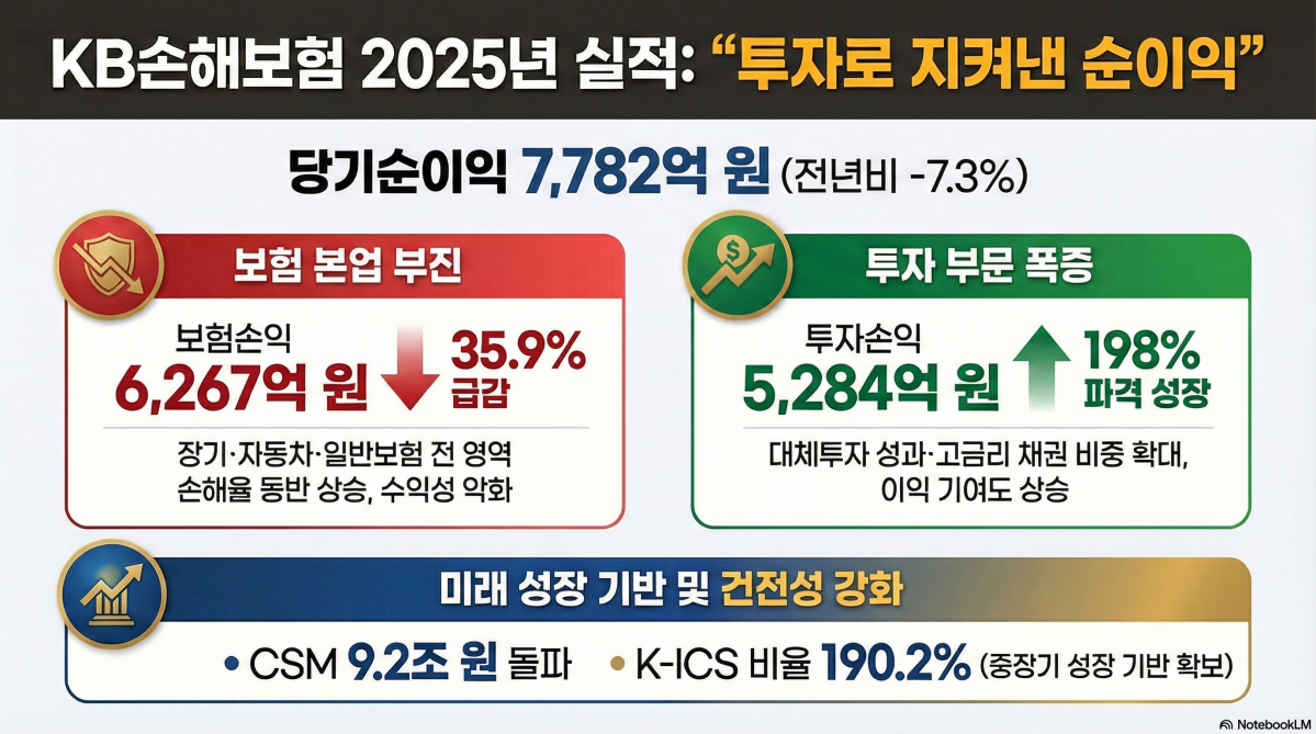 KB손해보험은 2025년 연간 당기순이익이 7782억원으로 집계됐다고 5일 밝혔다. 전년(8395억원) 대비 7.3% 감소한 수치다. 전 보종 손해율 상승으로 보험손익이 크게 위축됐지만, 투자손익이 개선되며 순이익 감소 폭은 제한됐다.